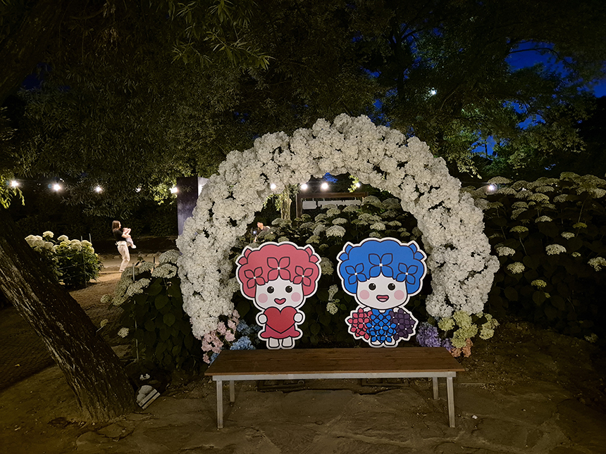 어둠이 짙어지면 하나 둘 조명이 켜지며 불빛 아래 수국은 더욱 아름답고 예쁜 모습입니다. 낮 시간은 다소 더울 수 있으니 시원해지는 저녁 시간에 관람하시면 더욱 색다른 화려함과 수국의 매력을 느낄 수 있어요.
