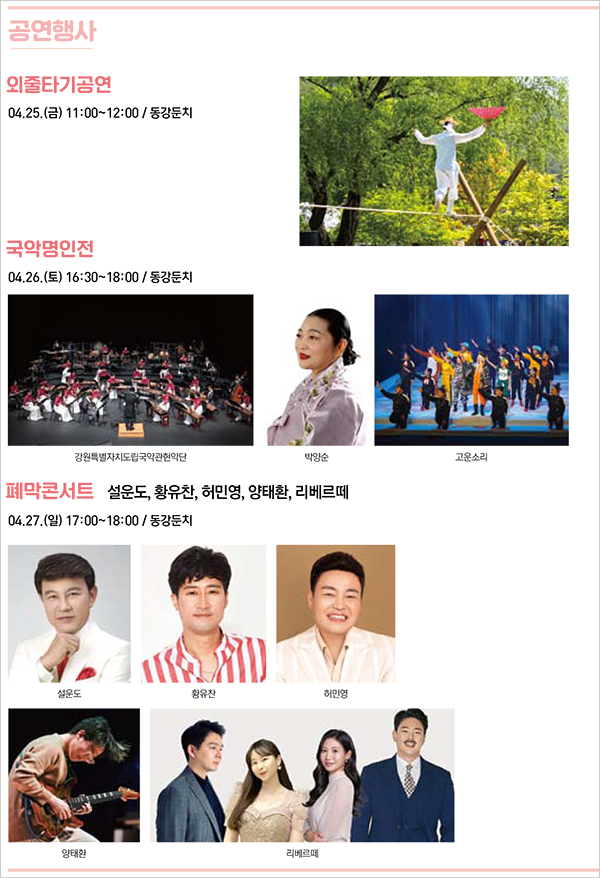 | 4.27(일) | 전통혼례, 칡줄다리기행사, 충절만세골든벨, 단조예술제 2부, 폐막콘서트 등 |