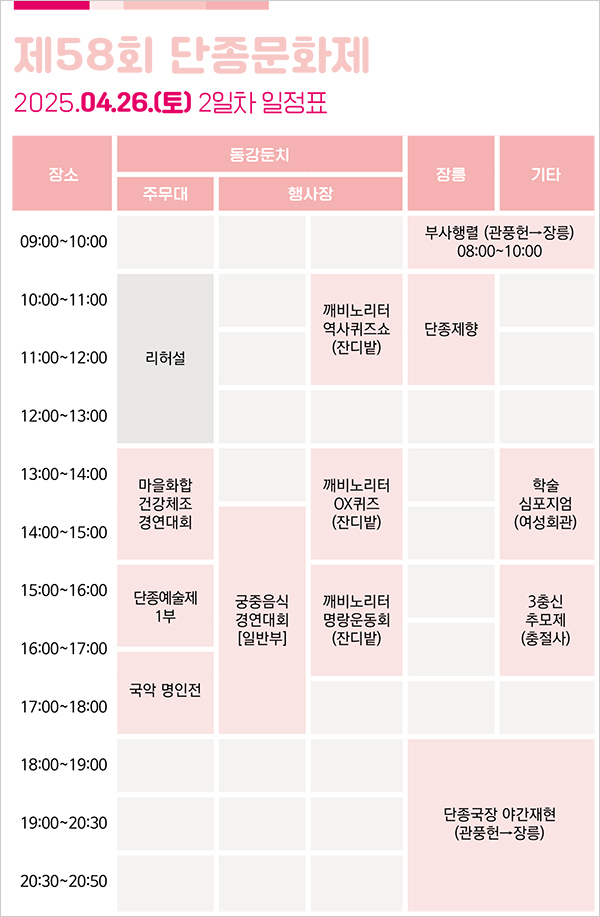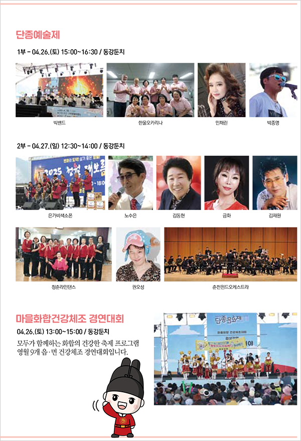 | 4.26(토) | 마을화합건강체조경연대회, 단종예술제 1부, 3충신 추모제, 국악명인전, 부사행렬 등 |