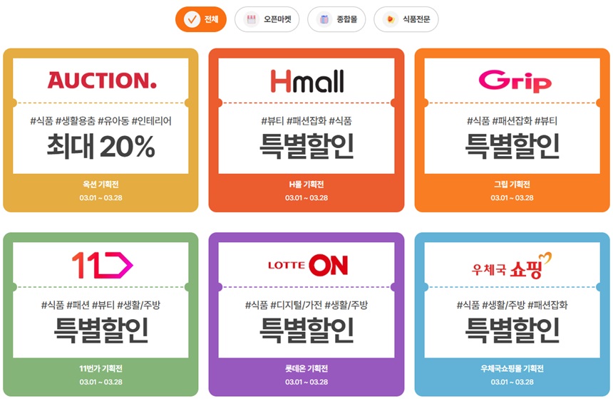 - 참여플랫폼 : 11번가, G마켓, 롯데온, SSG닷컴, 쿠팡, 티몬, 위메프, CJ온스타일, GS샵, 홈쇼핑&라이브, 인터파크쇼핑 등 50여개 온라인 플랫폼과 1,000여개의 오프라인 매장참여